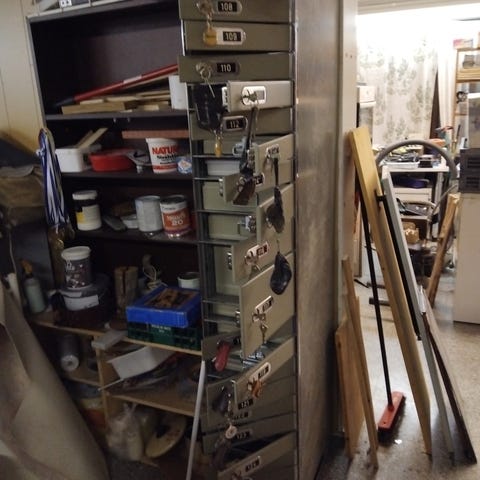 Puinen painava lokerikko metallisin kulmavahvistuksin. Sivuilla kädensijat. Koko 41 x 31 cm, korkeus 10 cm.Yksittäisen lokeron sisämitta 9 x 9 x9 cm. Ollut vain koristeena. Puussa on alunperin luonnostaan elävyyttä ja halkeamia.