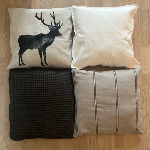 Pellavaiset koristetyynypäälliset, toinen puoli ruutukuviota, toisella puolella kasvi. Toisen tyynyliinan kulmassa pieni reikä. Hinta kahdelle. Pesulappu kulunut.