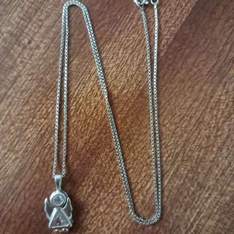 Aitoa hopeaa (leima kuvassa 3) oleva hyväkuntoinen enkeliriipus. Mukaan saa korurasian, en muista onko korurasia oikeasti korulle kuuluva. Päässä kirkas kivi ja mekko-osa punaruskeaa kiveä,en tiedä mitä materiaalia ne on. Enkelin pituus n. 1,5 cm ja ripustusosan kanssa n. 2 cm. Leveys n. 1 cm.