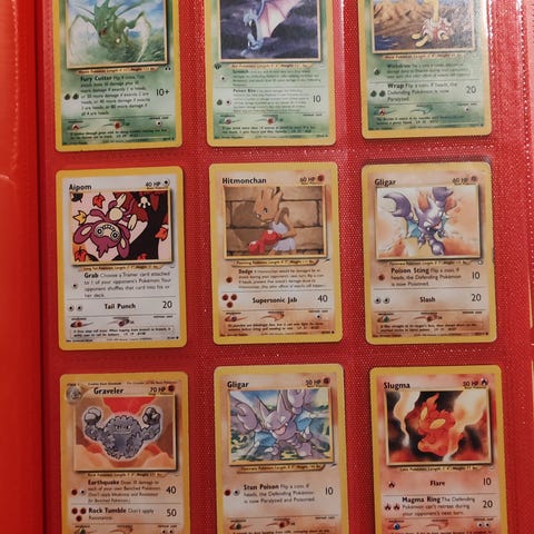 Pokémon kortteja. Kortit ovat eri kuntoisia. Kysymällä saa lisää tietoa