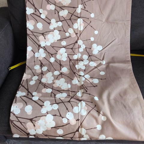 2 kpl lumimarjaverhoja. Puuvillasatiinia ja ompelijalla teetetyt. Todella hyväkuntoiset. Säilytyksen jäljiltä vaativat toki huolellisen silityksen. Mitat 140x214