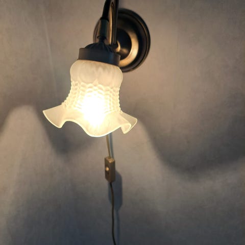 Teräs/lasi. Kupu irtoaa tarvittaessa ja varsi on nivelletty, voi laittaa useaan asentoon. Pistokkeella ja katkaisijalla. E14 kantaiselle lampulle. Valmistaja Rauta-Kesko.