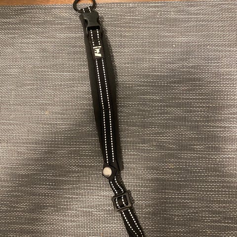 Tumma turkoosi avainnauha, jonka pituus avattuna noin 1m, leveys noin 2cm. Hyvä hätävara-talutin esimerkiksi metsälenkille.