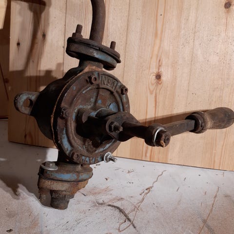 Heti ensi vuonna 50vuotta täyttävä pumppu. Ei tarkemmin tietoa mistä on jne. Akseli pyörii ja ilmeisesti 3 mäntäinen tai kalvoinen, miten ikinä toimiikaan. Jos keksit käyttöä tai haluat palan maalaishistoriaa niin ota yhteyttä.