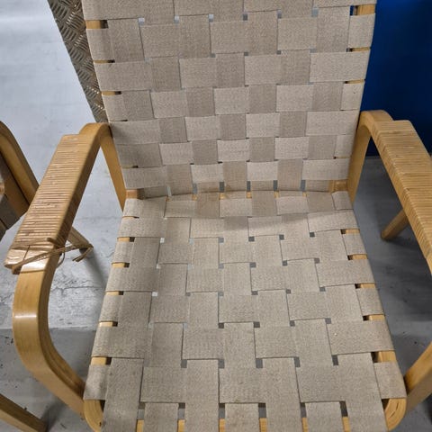 Hyväkuntoiset Aino Aallon suunnittelemat sirot ja tukevat mustat satulavyötuolit.