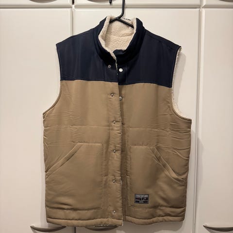 Miesten käännettävä liivi. Toiselta puolelta fleecepinta ja toiselta puolelta kiiltävämpi kuvissa näkyvä. Fleecepuoli sininen ja toinen puoli musta.