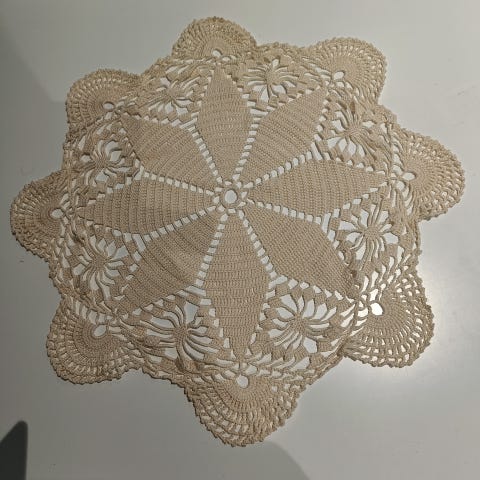 Hyväkuntoinen pikkuliina. Halkaisija n. 20 cm.