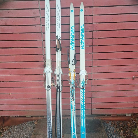 Valmiit siteiden paikat easy grip siteille, kantaa painavempaakin hiihtelijää maastossa. Alunperin mäkihyppysukset, mut juuri itselle tein niistä eräsukset juuri kantavuuden takia, nyt joutavat seuraavalle innokkaalle, suksien mitat näkyy kuvassa.