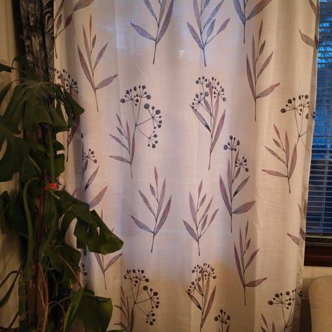 3 kpl juhlavaa pitkää verhoa korkeaan tilaan. Eurokankaasta ostettu kangas ja siellä myös ommeltu. Kangas kiiltelee valon määrän mukaan. Väri taittuu harmaan ja ruskean välimaastoon.