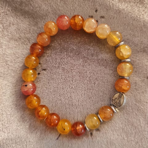 Kaunis rannekoru kukkaakaattihelmistä joustavalla langalla. Helmet on pyöreä leikattu korostamaan kivien luonnollista kiiltoa.