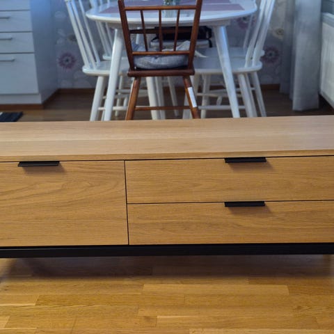 Uusi BY NIEMI tv taso. Jämäkkä mustaksi maalattu metalli runko, kansi metalli pinnalla. Tehdas kasattu tuote. Huomioithan tuotteen mitat kun noudat tuotetta. Ei mahdu henkilöautoon, farkkuun varmaan sujahtaa.