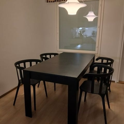 Pöydän ja tuolien väri on musta tai ihan tumman ruskea. Pieniä käytön jälkiä löytyy. Ollut käytössä kahdella aikuisella. Ei eläimiä taloudessa. Mukaan saa tuolin pehmusteet.