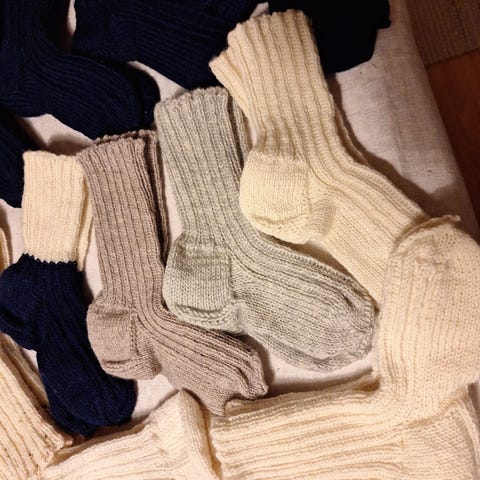 Pitkällä varrella olevia käsinkudottuja villasukkia. Hinta 7 euroa