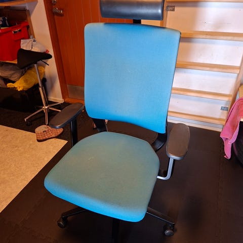 Mustavalkoinen toimistotuoli, jossa säädettävät käsinojat, selkänojan ja korkeuden säätö. Vain haku.