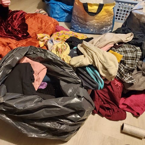 Jätesäkillinen sekalaista vaatetta.