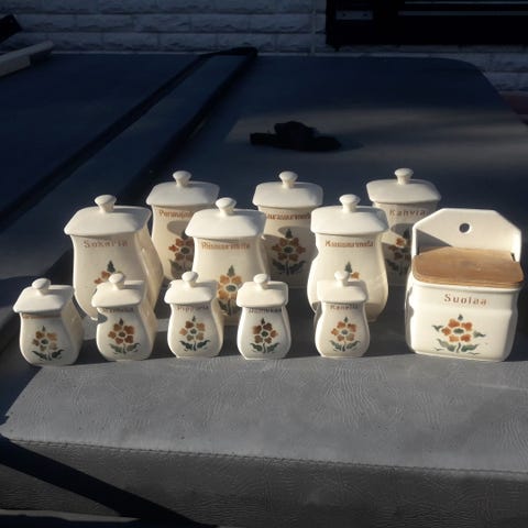 Kuvien hyllylliset hyllyineen Arabiaa ym.kotimaista vanhaa kukallista kuppiparia,kerma/sokerikkoja ym. Ei aivan priimaa,säröjä ja kulumaa löytyy. 100/hylly.150yhteensä.Kuppipareja, eikä muita myydä erikseen.Ilman hyllyjä kaikki yhteensä 100