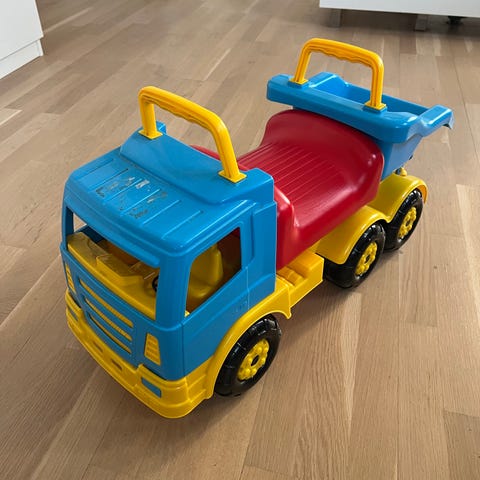Myydään kaksi lelurekkaa. Rekkojen pituus noin 20 cm.