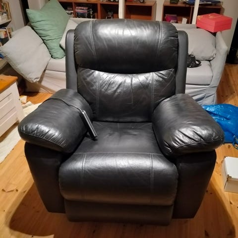 Musta lepakkotuoli, lahjaksi saatu. Vaikuttaa olevan aitoa nahkaa. Muutaman vuoden vanha ja suurimmaksi osaksi ollut vain koristeena