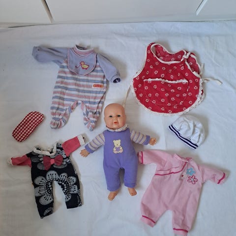 Vauvanukke, jolla on vaaleanpunainen mekko ja valkoinen huivi, muovinen vartalo. Pituus 40cm. Nukella ei ole tukkaa.