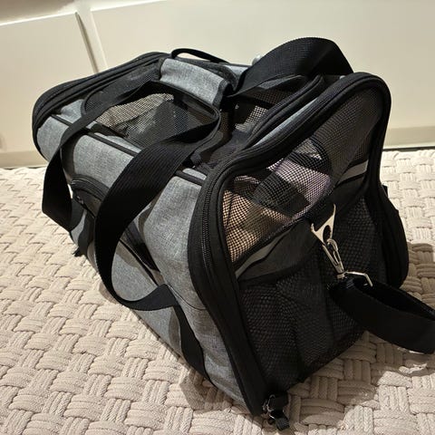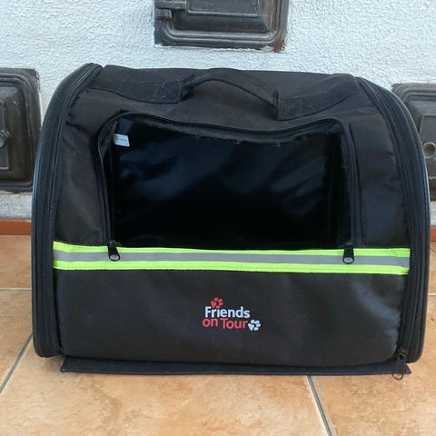 Matkakuljetuskassi, sininen ja musta, valmistettu kestävästä kankaasta. Sopii pienten lemmikkien kuljettamiseen. Varustettu kantokahvoilla ja säädettävällä olkahihnalla. Sivut ja yläosa verkkokangasta ilmanvaihtoa varten.