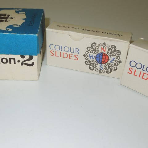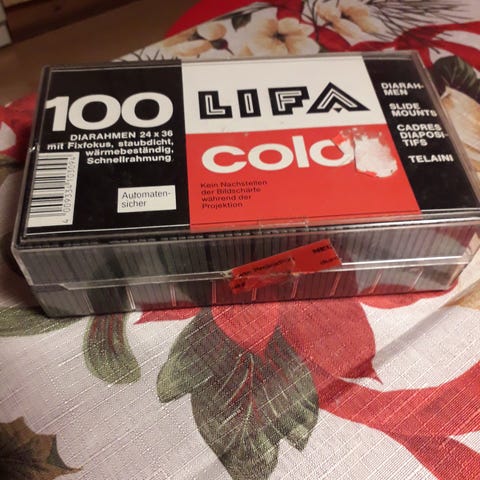 Paljon tyhjiä diaraameja. Osassa lasiset levyt osassa ei. Mukaan myös dianpainamiskone johon on vielä jäljellä tarroja ja laseja.