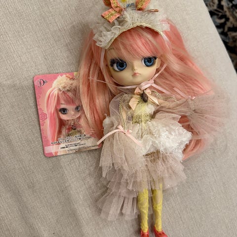Pullip nukke Kiyomi, mukana vaatteet. Nukella on vaaleat hiukset, silmät ja yksityiskohtaiset kasvot. Mukana vaaleanpunainen karvainen hattu ja monikerroksinen mekko, jossa on vaaleanpunaisia ja violetteja sävyjä. Nuken jalassa pehmeät tossut. Soveltuu keräilyyn tai leikkeihin. Mukaan myös nuken kortti.