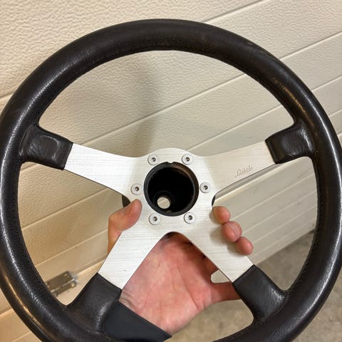 Volvo Ratti, musta nahkainen materiaali. Sopii tiettyihin Volvo-malleihin, sisältää ohjauspainikkeet. Käytetty auton ohjauspyörä ilman keskipalaa.