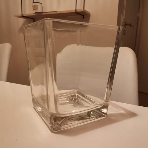 Lasinen maljakko, jonka korkeus noin 18,5cm ja pohjan halkaisija noin 7,5cm. IKEA, design Emma Dafnäs.