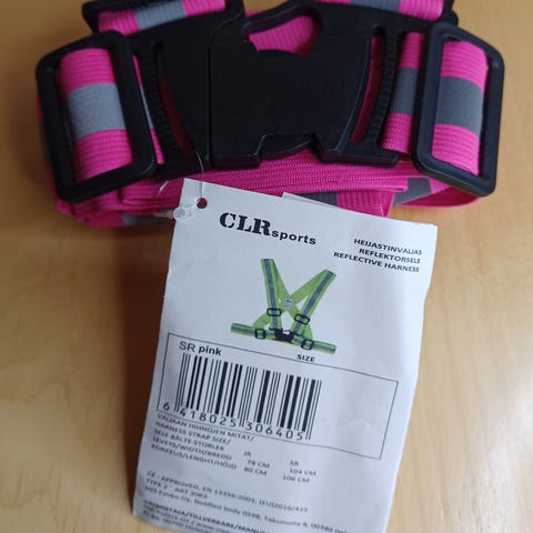 Neonkeltaiset ja heijastavat CLRsports huomiovaljaat, jotka pienimmillään menevät lapselle ja isoimmillaan isokokoiselle aikuiselle. Valjaita kolmet, hinta 3eur/kpl.