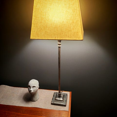 Pöytävalaisin hopeanvärisellä rungolla ja vaalealla varjostimella.