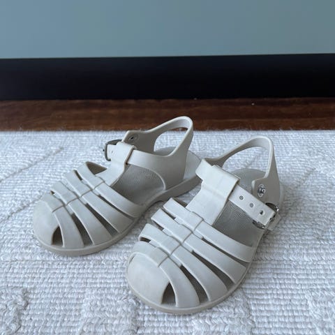 Hiekanväriset Liewood sandaalit koko 21. Erinomaiset kengät vaikkapa etelänlomalle. Ei haittaa vaikka kengät kastuvat rannalla. Hyvin pitävät ja taipuisat pohjat, jotka jättävät söpöjä pandan kuvia jalanjälkiin.