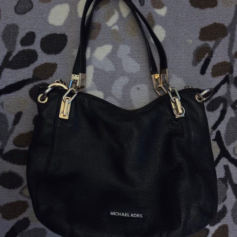 Kaunis Michael Kors Brooke Lg shldr tote nahkainen musta käsilaukku / nahkalaukku. Laukussa on kullanväriset metalliosat ja vetoketjullinen yläosa. Sisätilat sisältävät useita taskuja.