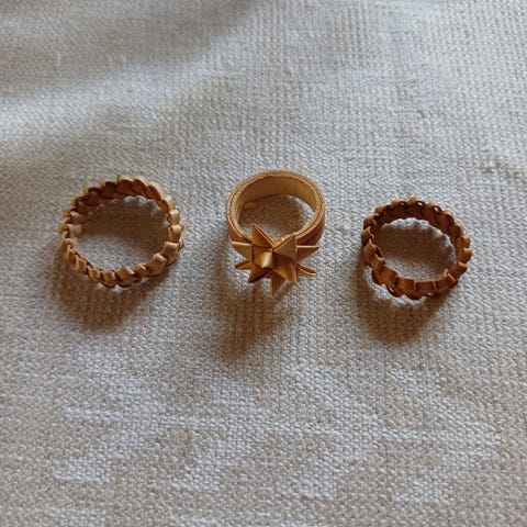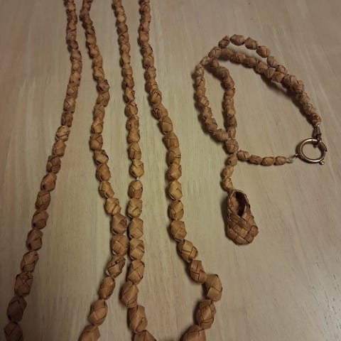 Tuohesta pyöritetyt helmet mustassa kangasnauhassa, jonka pituus noin 60cm.