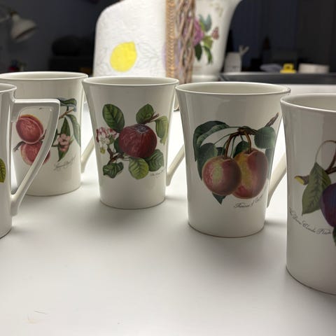 Myynnissä uutta vastaavat Pomona Portmeirion mukit (5 kpl), vetoisuus 0,28 l. Korkeus 11,5 cm, halkaisijat 6,5 cm ja 9 cm. Myydään ensisijaisesti yhdessä 75 €, erikseen 22 €/ kpl. Nouto, maksu käteinen/ mobilepay. Vaihto mahdollinen, ilmoita mitä löytyy.
