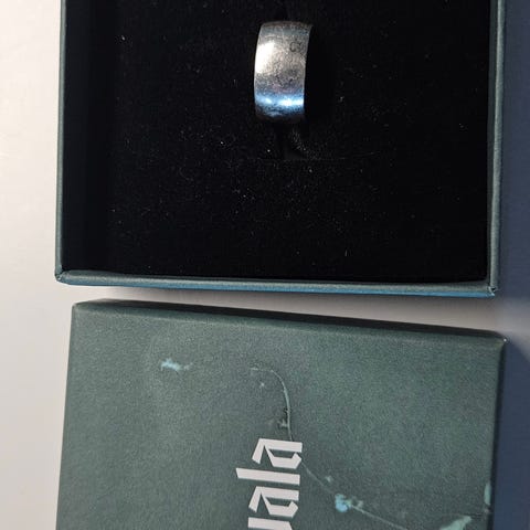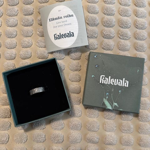 Sormuksessa kaiverrus. Yritin mittanauhalla mittailla ja sain koon 18. Mielellään nouto