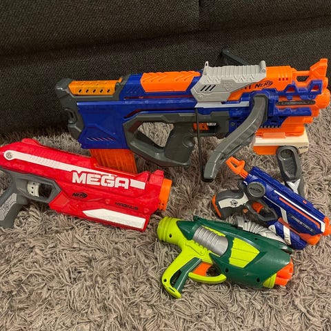 Kolme erikokoista nerf tyyppistä asetta 3kpl kuvan mukaan. Toimivia, mukana 5 ylimääräistä ammusta.