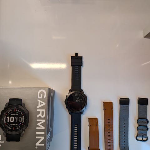 Garmin Fenix 7, 2022 ostettu, kuitti löytyy. Kuvassa näkyy pari pientä naarmua lasisssa klo 9 ja 12 kohdilla, ei häiritse käyttöä. Akku kestää todella pitkään, kellokäytössä 18 pv ja harjoituskäytössä yli 20h.