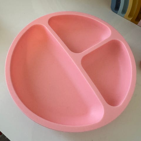 Myydään alustaan imukupilla tarttuva silikoninen lautanen lapselle.