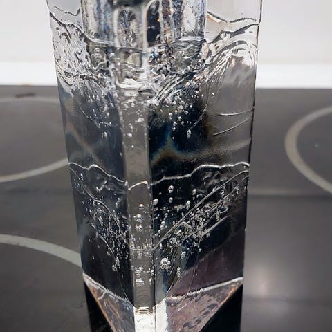 Kynttilänjalka on valmistettu muottiin valetusta kirkkaasta lasista, jossa on kauniita ilmakuplia.