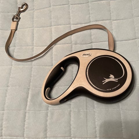 Flexi Comfort 2, punainen koiran talutin 5m. Talutin on suunniteltu keskikokoisille (max. 20kg) koirille. Kahvassa näkyy käytön jälkiä. Lukitus- ja jarrumekanismi toimii moitteettomasti.
