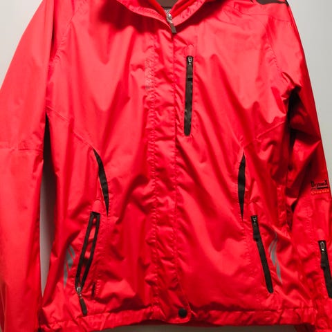Raiski ulkoilupuku. Punaiset housut, valko-punainen takki. Huppu. Vetoketjutaskut. Housujen lahkeissa vetoketjut.