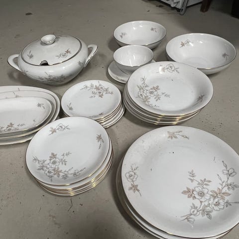 6 kpl kahvikuppi, 6 kpl lautanen, kermalla ja sokerikko 40€. Ruokailuastiasto 6 hengen kultareunuksinen + tarjoilu lautasia + keittokulho. 120€.