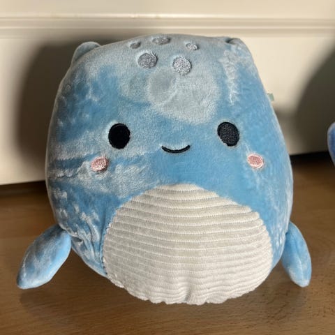 Noin 18 cm korkea Squishmallows - hahmo. Tämä ollut sängyn päällä ja pehmona käytössä hetken, eli Ei ihan uudenveroinen, mutta edelleen Erittäin Hyväkuntoinen, pehmeä rutistelukaveri!