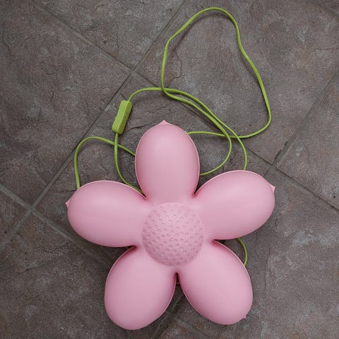 Supervanhoista seinälampuista itsetehdyt ja -muokatut kukkaislamput, värinä hailakan violetti ja vihreä. Meillä ei ikinä jaksettu laittaa seinälle. Lampunkanta e27.