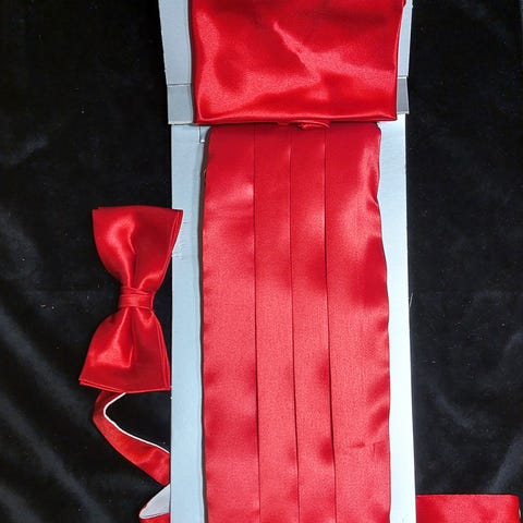Vaaleanharmaasta satiinista valmistettu Matexin solmio- ja taskuliinasetti miehille. Setti sisältää solmion, taskuliinan ja rusetin.