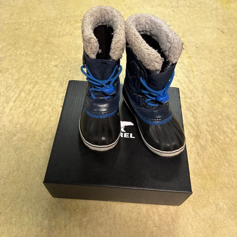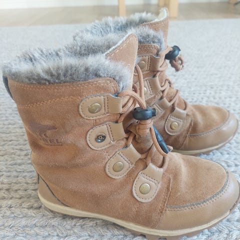 Kunto (englanniksi): I cleaned the outer material with Ecco foam, but some faint dirt traces still remain, so better to rewash with soap. Inside the right shoe, the wool lining came off in one place (see the photo, not too small spot), so either to use the silicone, or to attach some wool or felt material. Some small spots with too thin lining inside also in the left shoe (see the photoes). One picture with a snowboarder slightly faded at the edge.