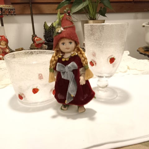 Kuvan lasiesineet mm. Nuutajärven Apila, Ultima thule, Karhulan lasitehtaan sinappilasit. Kaikki ehjä, paitsi lasihelistimessä ei kuulaa.