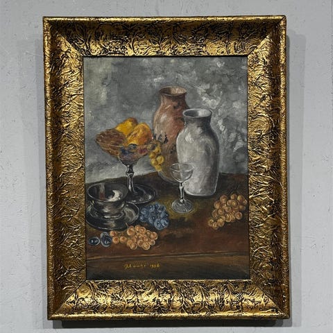 Hakusanat: maalaus - asetelma - taideteos - taide - kehys - kehystetty - öljyväri - teos - helmäkori - hedelmät - kultainen - kullan värinen - vintage - 1900 luku - antiikki - keittiö