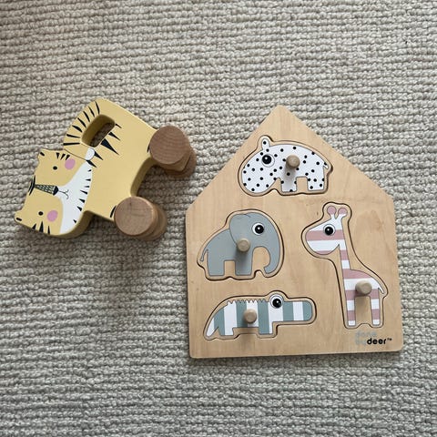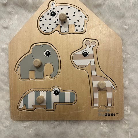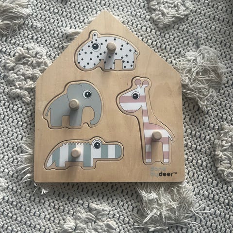 8 sisäkkäin menevää laatikkoa / palikkaa. DonebyDeer. Joka sivulla on eri teema: eläin, kuvio, numero. Yhdellä sivulla mittanauha. Laatikkopinosta tulee yhteensä metrin korkuinen.