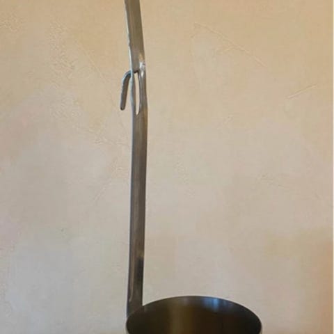 Hyväkuntoinen teräksinen soppakauha, päässä koukku. Pituus:34cm, kauhan leveys: 9cm
